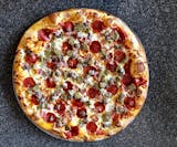 Pepperoni, sausage, hamburger, onion, peppers, mushroom.